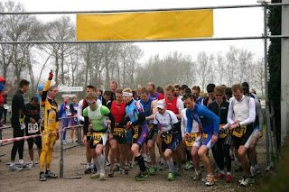 35 minuten voor de start kom ik aan. Regel snel de inschrijving (Bedankt Riekus!) en zet mijn spulletjes klaar. Warming-up is maar matigjes. Damn. In zo’n duathlon moet je altijd zo hard weg. Eigenlijk niets voor mij duathlons. Ik kon ‘s ochtends mijn armstukken niet vinden dus ik start in mijn tritanium trisuit. Het is immers een verenigingscompetitie wedstrijd. De opmerkingen zijn niet van de lucht. Dat ik wel erg zomers in de bol was. Ik hoop op een door de mist brekende zon. Ik leg nog een thermoshirtje neer bij mijn fiets. Lopen doe ik iig zo. Ben al zo snel warm.