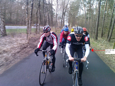 Hier werd ik even de maat genomen. Ben en Henk-Jan dansten voor me uit, Jochem (ook een beetje local) toch wel en ik moest mijn best doen om het wiel te houden van Esther. Deze mevrouw kan een behoorlijk potje fietsen.